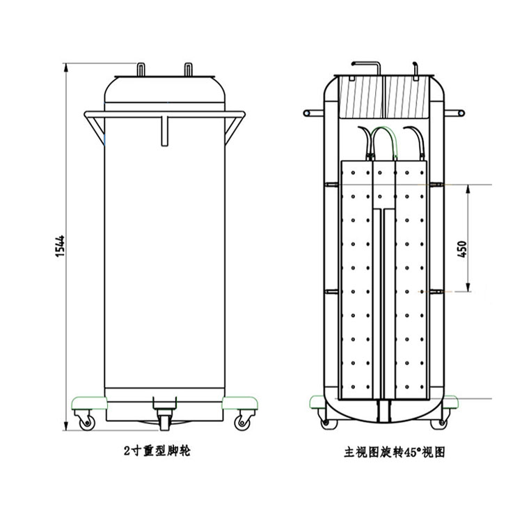 容器內已經(jīng)添加了支撐結構,以增強運輸耐性。容器采用高真空、多層絕熱結構的形式,真空層中設有吸附劑,能夠長期保持真空度。容器蓋由帽蓋和芯塞構成,芯塞采用絕緣性能優(yōu)良的硬質發(fā)泡塑料制成,不僅可降低液氮蒸發(fā)量,還能固定提筒。為了減少液氮在容器工作狀態(tài)中的蒸發(fā),提筒采用不銹鋼制造。提筒的提桿和桿筒組件之間采用玻璃纖維增強塑料細管連接,以提高絕緣性能。液氮罐上部安裝有定位環(huán),提筒可通過定位環(huán)上的槽和內膽底部的凸起以及芯塞而固定,使得工作狀態(tài)更加穩(wěn)定,安全地進行搬運和長途運輸。